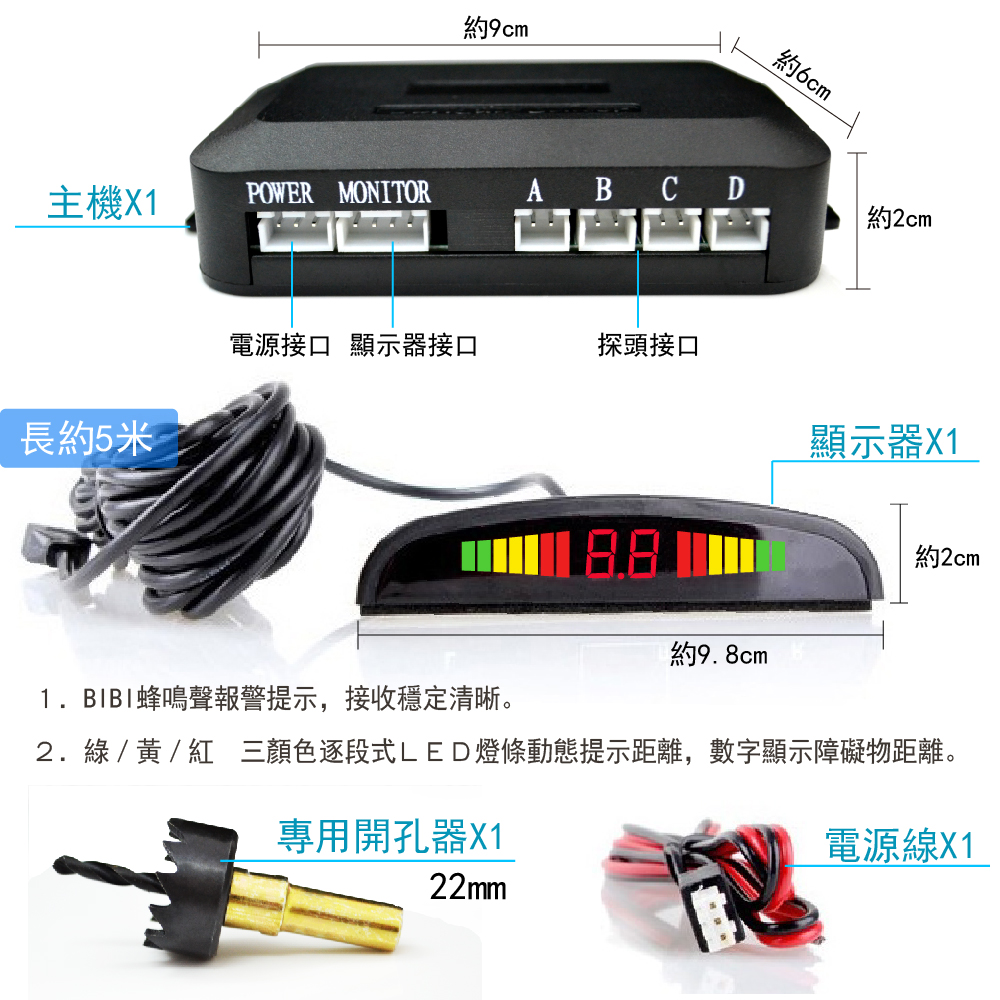 配件內容: 主機x1、月牙型顯示器x1、專用開孔器x1、電源線x1、防水探頭x4、雙面膠x2