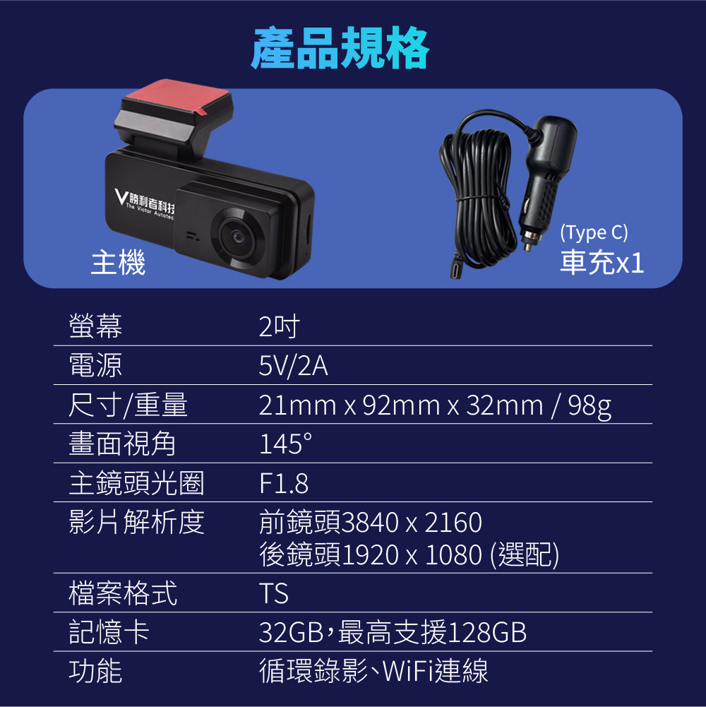 | 規格 | 主機(車前), 主機(車前)+32G記憶卡, 主機(車前)+64G記憶卡, 主機(車前)+128G記憶卡, 主機+後鏡頭(車前車後), 主機+後鏡頭(車前車後)+32G記憶卡, 主機+後鏡頭(車前車後)+64G記憶卡, 主機+後鏡頭(車前車後)+128G記憶卡 |